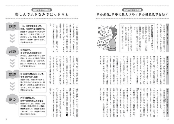 こんな変化はありませんか? 「声がかすれてきた」「声が弱くなっている」「高音が出にくい」「話していると疲れてくる」「若い頃より声が低くなった」。高齢になり、独居や夫婦二人での生活で声を出す機会が減ったという人も多いかもしれません。ひとつでもあてはまったら、ぜひ音読学習をはじめてみてはいかがでしょうか。